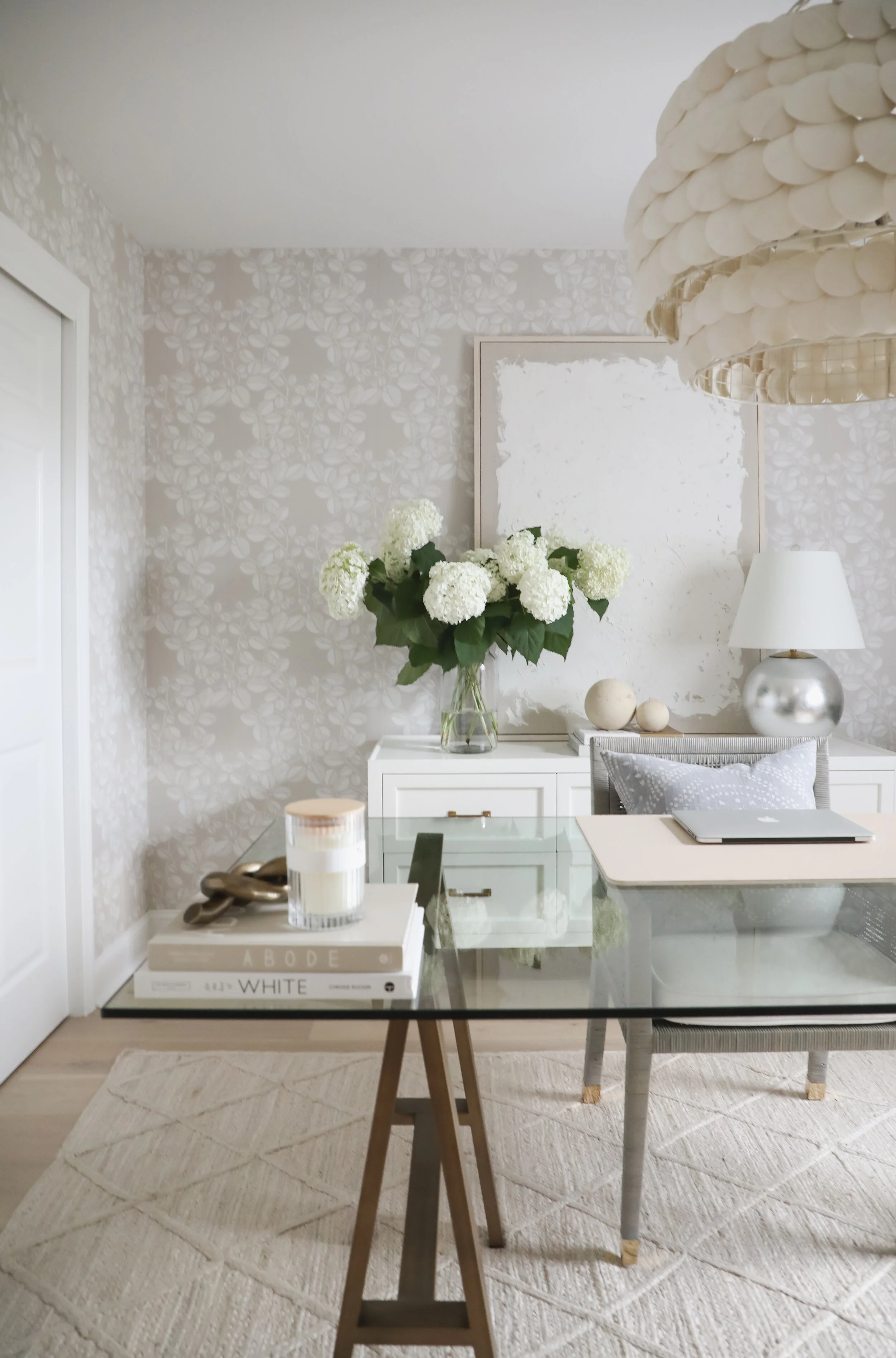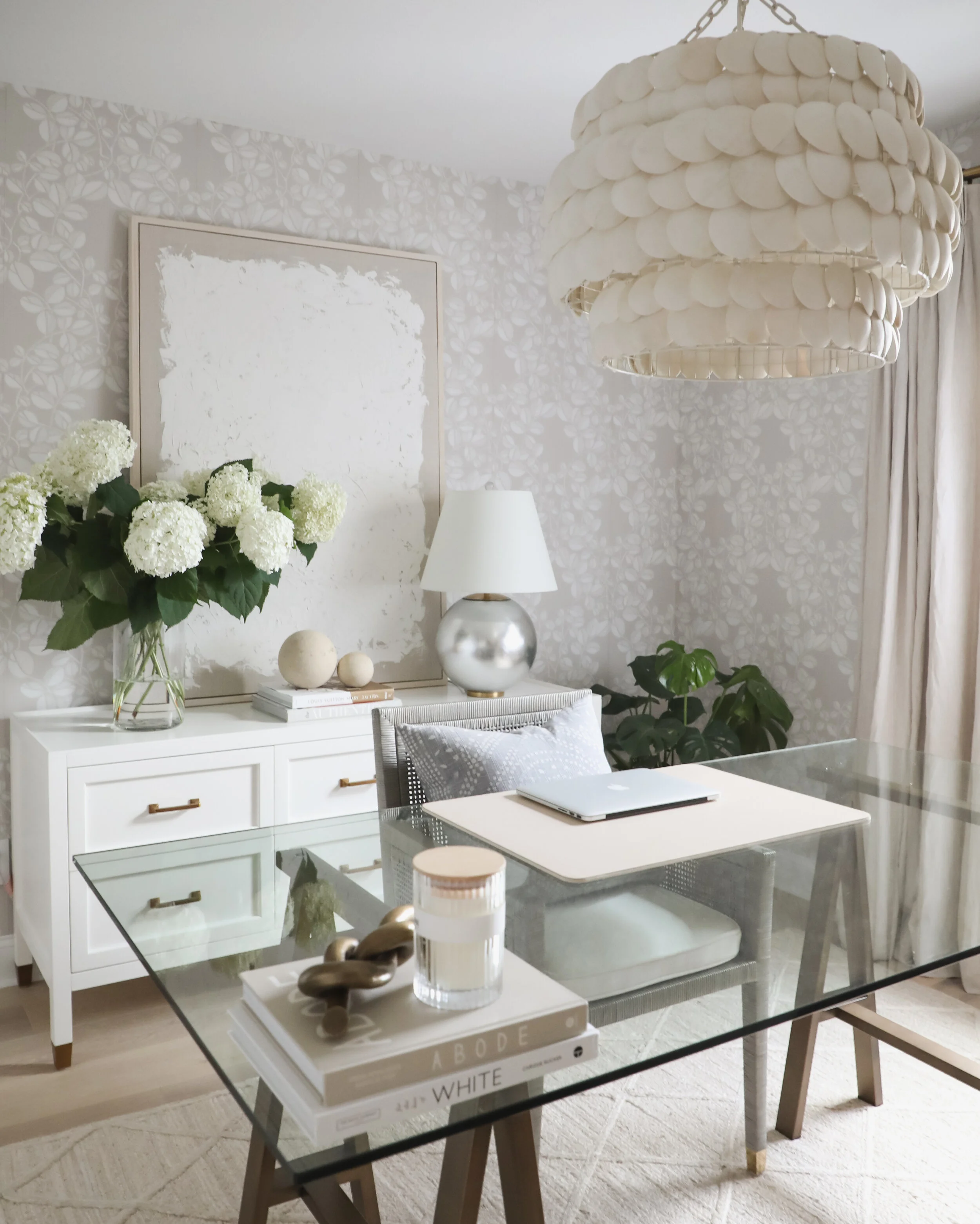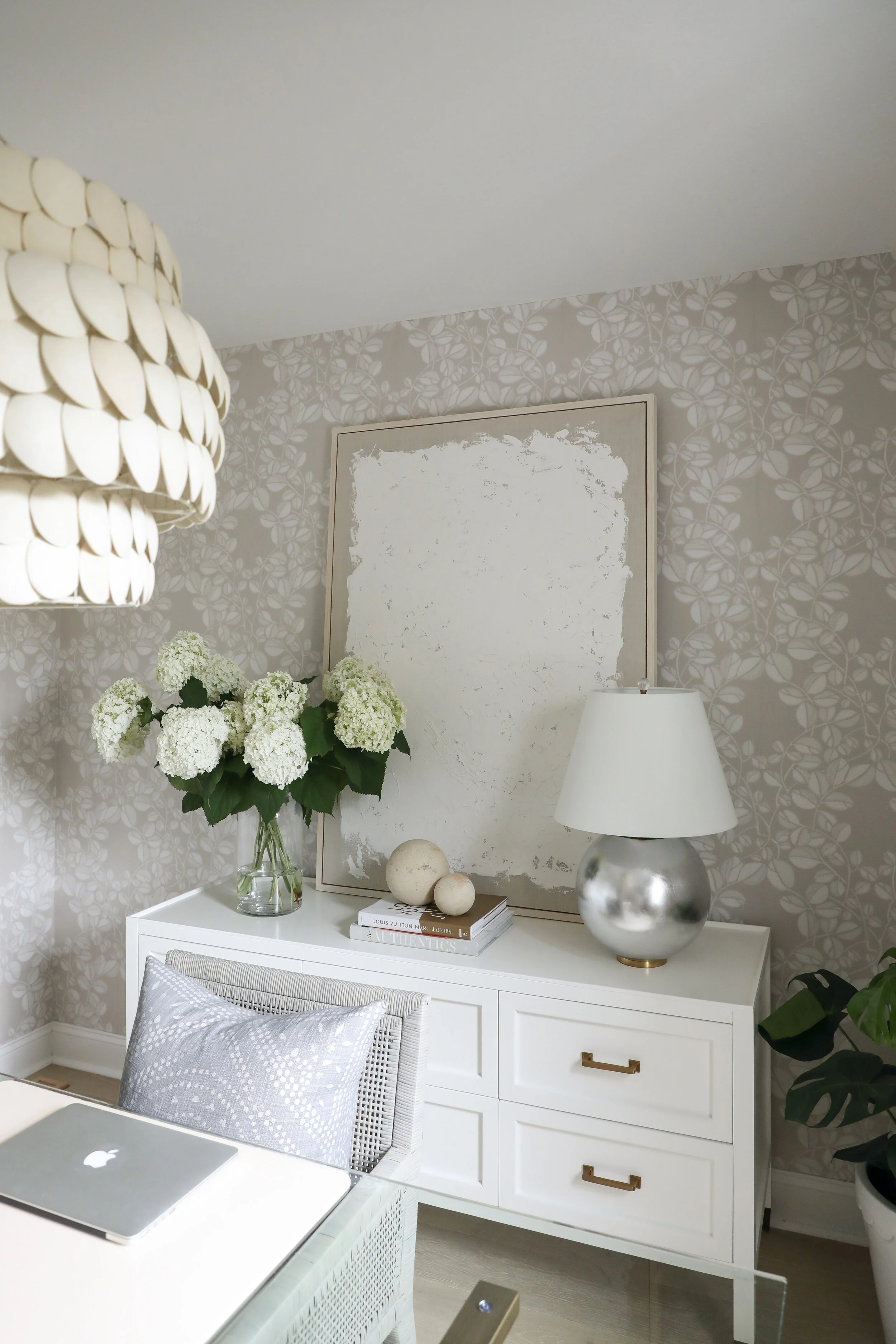 Today I’m sharing a home office update! As you all know, in March and April I worked very hard to turn this space that once was our guest room, into the office of my dreams! I’ve now had my Serena and Lily Pierson Dresser in my office for about three months, so I wanted to share a review of how I’m liking it. I originally sourced this piece for my new office because my sample library was growing and I needed a ton of storage space. I chose the Pierson Dresser because of its wide width (62” wide, 20” deep) and it’s versatile silhouette. I love that this piece is the focal point of the space. It really grounds the back wall, and compliments the Valley Wallpaper so nicely.