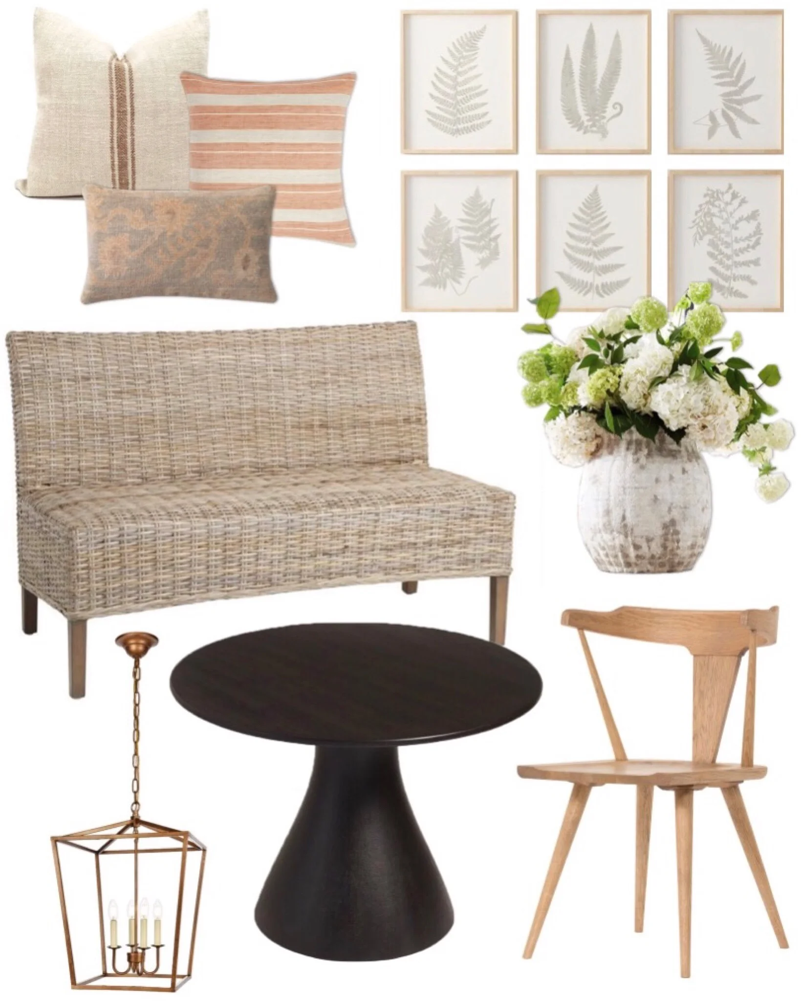 Table \\ Settee \\ Chair \\ Artwork \\ Grainsack Pillow \\ Striped Pillow \\ Lumbar Pillow \\ Vase \\ Pendant Light